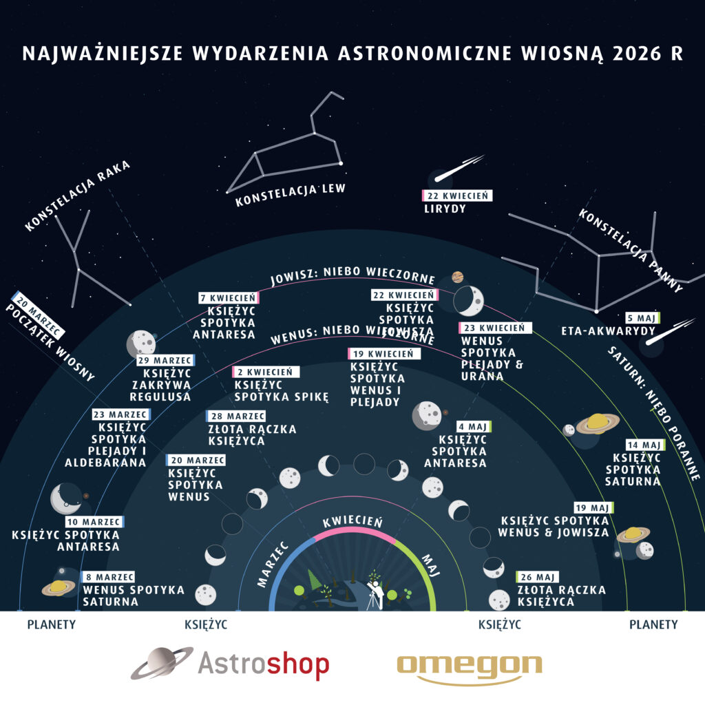 Nasze „Astro Highlights Wiosna 2026” przedstawiają wszystkie najważniejsze daty: grafika pokazuje kluczowe wydarzenia w skrócie, a poniżej w tekście znajdziesz ich szczegółowy opis.