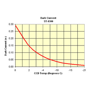 TE cooling: In tests of production samples, the camera reached a maximum of -40°C below ambient in a warm room in less than 3 minutes after the cooling was turned on. It was allowed to stabilize and after a few more minutes the regulation was enabled A few degrees were then given up for regulation with the camera running at only 80% TE cooling power to maintain -36 degrees C below ambient. Because of this CCDs extraordinarily low dark current, great temperature deltas are not required to achieve a dark current low enough that it becomes relatively insignificant compared to the read noise and sky background. For example, in a test, one 15 minute dark frame taken at -10°C was subtracted from another 15 minute dark frame taken at the same temperature. The total noise in the remaining image was ~15 electrons which included both dark current noise and read noise. This is exceptionally low.
