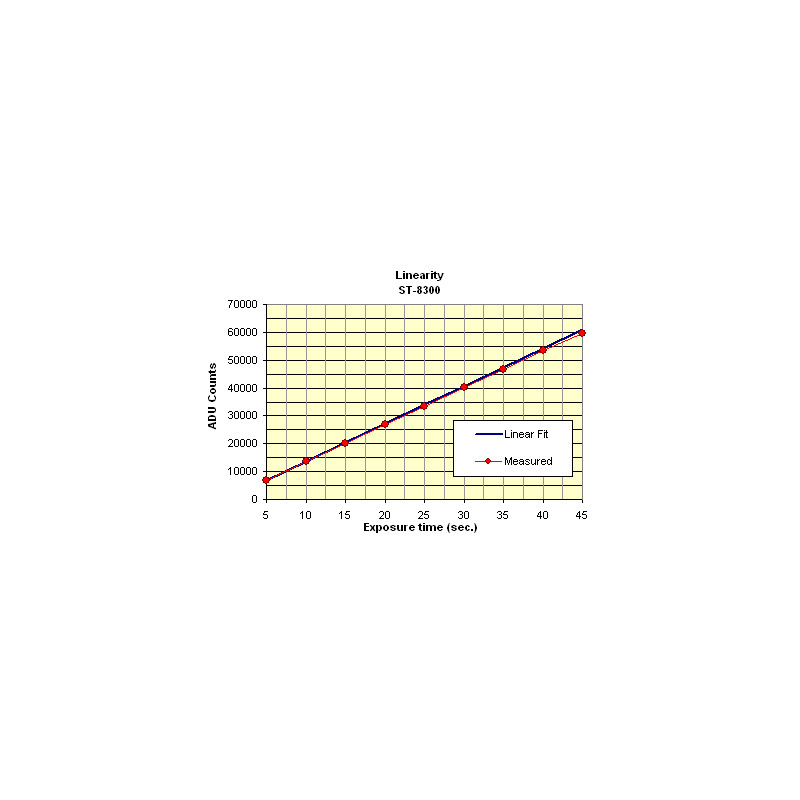 Linearity: Linearity is measure of how flat the CCD response is to light with increasing exposure times. For instance, an ideal CCD will record exactly twice the signal in a 20 second exposure as it does in a 10 second exposure from a constant light source. This is particularly important in photometric studies where the CCD is used as a tool for measuring light at various wavelengths to determine the temperature of stars. The sample we measured is about 10x better than Kodak's allowed specification, with a response that is within about 1% of linear (up to approximately 50,000 counts (binned 2x2).