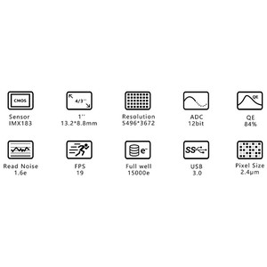 Na polu zastosowań astronomicznych, matryce Sony IMX183CLK-J (monochromatyczna) i IMX183CQJ-J (kolorowa) wykorzystują podświetlaną strukturę o bardzo wysokiej czułości i wysokiej rozdzielczości przy rozmiarze piksela 2,4 μm. Kamery ASI183 mają bardzo dużą pełną pojemność studni(15000e) dla tak małego rozmiaru piksela, szum odczytu 1.6e @ 30DB oraz 12-stopniowy zakres dynamiki @ Gain=0. Kamery ASI183 wykorzystują również funkcje firmware do minimalizacji efektu amp-glow dla maksymalnej wydajności w astrofotografii.