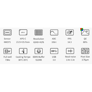 - Bardzo wysoka rozdzielczość dzięki pikselowi o rozmiarze 3,76 µm - idealna kamera do teleskopów o dużej światłosile, np do refraktorów APO czy konstrukcji typu Hyperstar, Celestron Fastar itp.