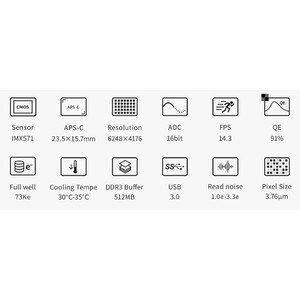 - Bardzo wysoka rozdzielczość dzięki pikselowi o rozmiarze 3,76 µm - idealna kamera do teleskopów o dużej światłosile, np do refraktorów APO czy konstrukcji typu Hyperstar, Celestron Fastar itp.