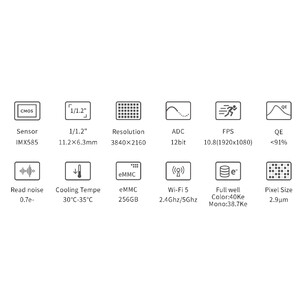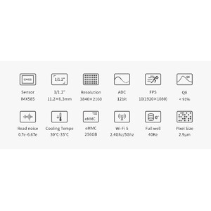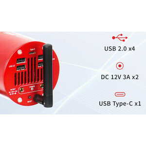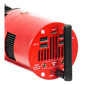 Dwuzakresowa sieć WLAN: Zewnętrzna antena dwuzakresowa, obsługująca częstotliwości 2,4 GHz i 5 GHz, zapewnia stabilne i płynne działanie aparatu fotograficznego w promieniu 20 metrów. Dzięki aplikacji ASIAir firmy ZWO można sterować aparatem fotograficznym i oglądać zdjęcia za pomocą smartfona.