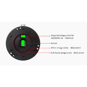 Wymagania dotyczące teleskopu: Aparaty fotograficzne ZWO Air są kompatybilne z teleskopami obsługującymi format obrazu APS-C lub większy. W przypadku używania teleskopu z kręgiem obrazowym APS-C mogą wystąpić niewielkie zniekształcenia gwiazdy prowadzącej. Aby uzyskać bardziej precyzyjne i stabilniejsze śledzenie (autoguiding), zalecamy użycie teleskopu z pełnym formatem lub większym kręgiem obrazowym.