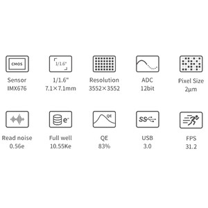 Aparat fotograficzny jest wyposażony w nowoczesny czujnik 1,6" o rozdzielczości 3552*3552 Pixeli. Oprócz nowoczesnej technologii Starvis 2 (z podświetleniem tylnym) IMX676 zapewnia niezwykle płynny obraz bez efektu wzmacniacza (Amp-Glow) – ale przede wszystkim przekonuje bardzo wysoką rozdzielczością 2,0 µm Pixeli oraz stosunkowo wysoką częstotliwością odświeżania. Dzięki temu aparat fotograficzny nadaje się przede wszystkim do następujących zastosowań: