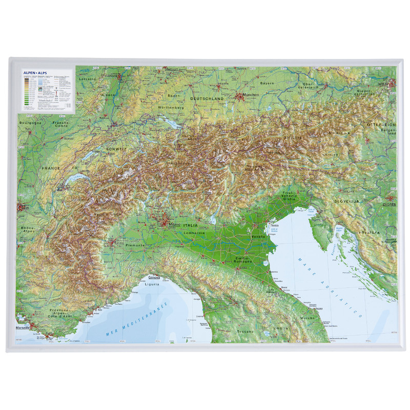 Zawartość: Relief krajobrazu Alp z szczegółowymi obszarami zabudowań, siecią wodną, nazwami miejscowości, siecią kolejową, siecią autostrad z numeracją, drogami dalekobieżnymi i szybkimi, nazwami gór, informacjami o wysokościach, międzynarodowymi lotniskami.