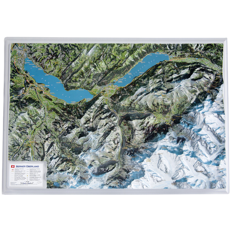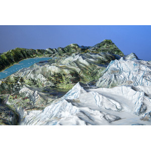 Prawdziwa mapa reliefowa w 3D regionu Berner Oberland z cieniowaniem reliefu i kolorowymi warstwami wysokościowymi, które zostały uzyskane na podstawie modeli terenu o wysokiej rozdzielczości. Podjęto próbę graficznego przedstawienia Państwu szczegółowości zdjęcia lotniczego.