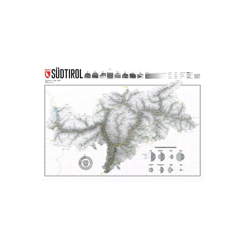 Nad mapą znajduje się również ilustracja przedstawiająca wybrane najpiękniejsze góry Południowego Tyrolu!