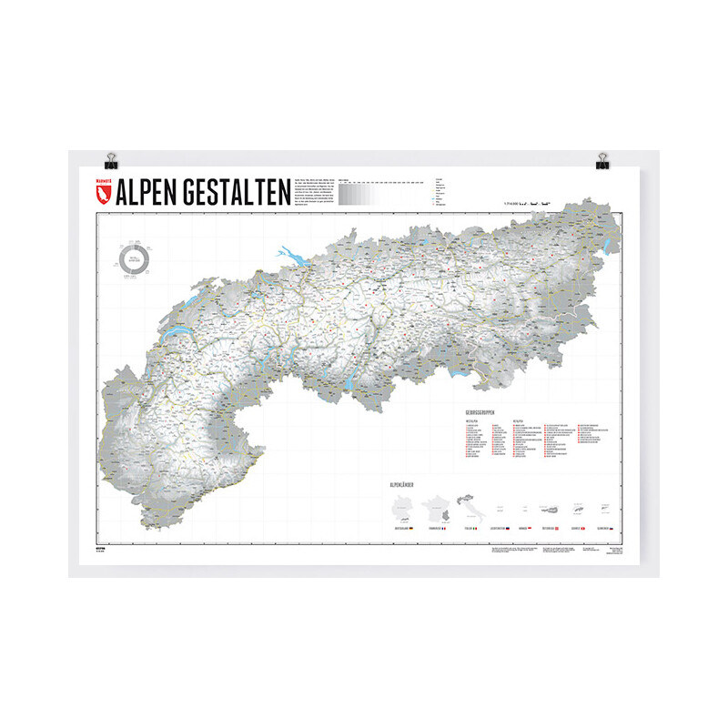 Podstawą naszej mapy są linie wysokościowe w odstępach co 250 metrów. Dzięki temu mapa jest plastyczna i dobrze oddaje topografię Alp. Oprócz granic ośmiu krajów alpejskich i ich regionów zaznaczono najważniejsze drogi, przełęcze alpejskie i rzeki, a także miasta i góry jako punkty orientacyjne. Na mapie zaznaczono również granice regionów poszczególnych krajów alpejskich. Na mapie zaznaczono i wymieniono 63 grupy górskie Alp według definicji Paula Zahna.