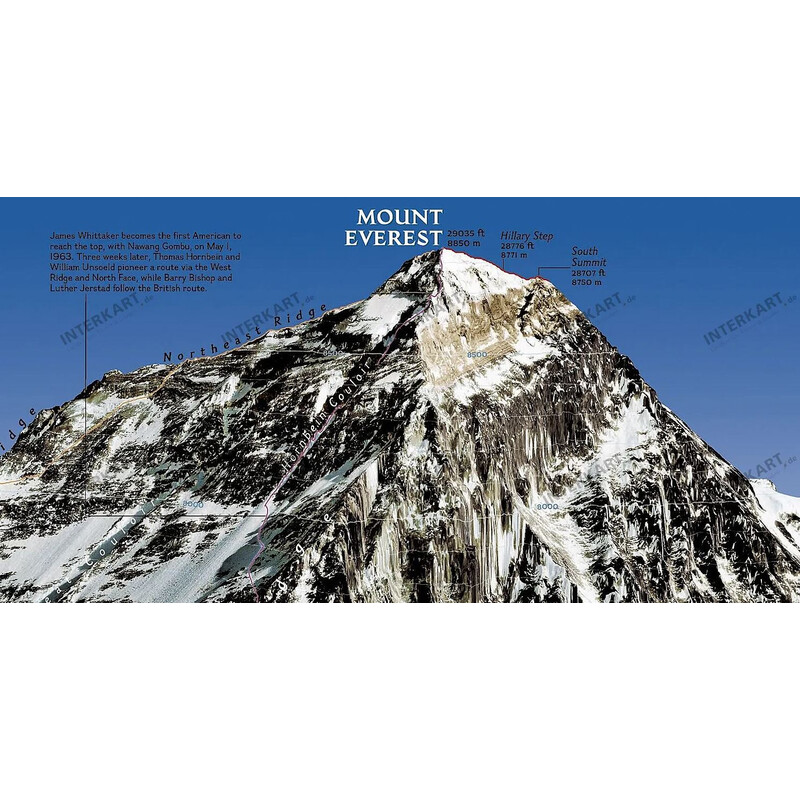 Z okazji 50. rocznicy pierwszego wejścia na Mount Everest przez Sir Edmunda Hillary'ego i Tenzinga Norgaya w maju 1953 r. renomowany producent map National Geographic wydał tę imponującą mapę.