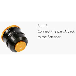 Montaż: Korektor krzywizny pola wkręcany jest w gwint wyciągu okularowego. W tym celu od wyciąku należy odkręcić element oksydowany w kolorze. Zadaniem tego elementu jest trzymanie tulei okularowej, ale podczas korzystania z korektora nie będzie on potrzebny. Co innego np podczas mocowania lustra diagonalnego. Po usunięciu wspomnianego elememtu, korektor krzywizny pola należy po prostu wkręcić w gwint kończący wyciąg okularowy. Aby połączyć kamerę lub aparat z korektorem, należy użyć adapter z mocowaniem T2. W przypadku lustrzanki lub bezlusterkowca, konieczny będzie adapter wyposażony w mocowanie typowe dla danej firmy. Finalnie otrzymujesz bardzo solidny i sztywny układ optyczny, bez możliwości ugięć.