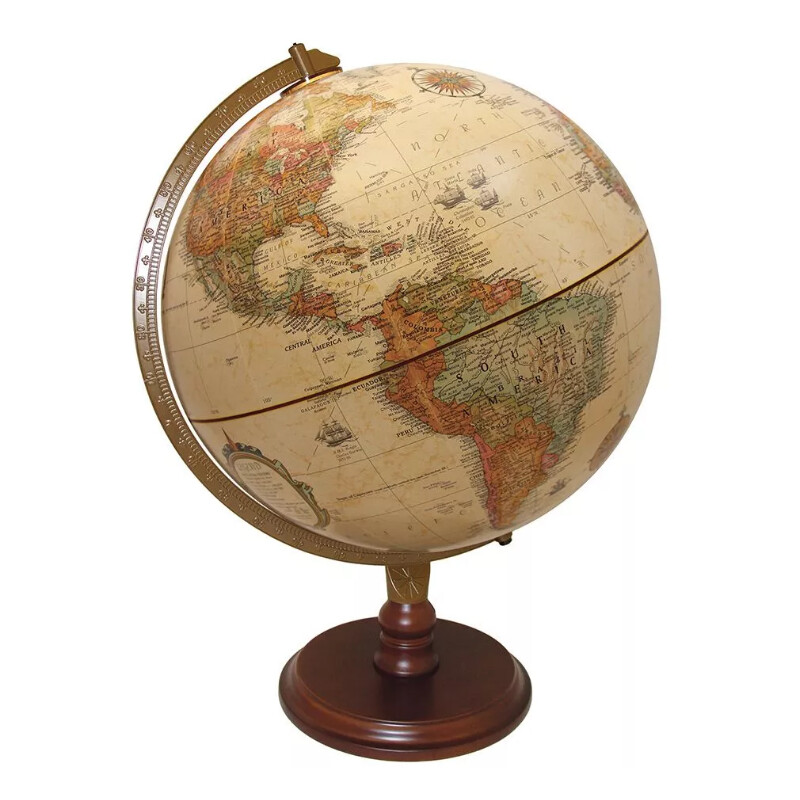 Podstawa z twardego drewna z wykończeniem w kolorze orzecha włoskiego oraz meridian z lakierowanego odlewu ciśnieniowego sprawiają, że ten globus jest wyjątkowo wartościowy i stanowi idealny wybór do wymagających wnętrz.