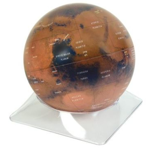 The globe comes with a freestanding, clear plastic base and an information card describing key Mars facts and how the globe was made.