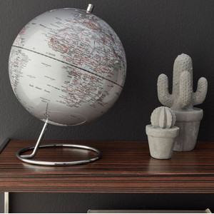 Globus GALAXY o wymiarach 240 x 310 mm z angielskimi napisami przedstawia naszą planetę wraz z mapą topograficzną – tak, jak wygląda ona z perspektywy kosmosu. Środkowa oś symuluje oś obrotu Ziemi i umożliwia oglądanie jej ze wszystkich stron. Aby zapewnić maksymalną stabilność, globus spoczywa na wysokiej jakości chromowanej podstawie.