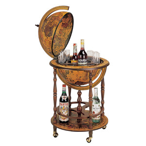 Globus barowy na podstawie z pięknymi ilustracjami potworów morskich, syren i postaci mitologicznych na mapie. Globus Regolo posiada wewnątrz schowek na 2-3 niskie butelki i około 9 szklanek. Dodatkowe butelki można umieścić na dolnej półce, ozdobionej różą wiatrów i całkowicie zgodnej z znakami zodiaku wokół równika.