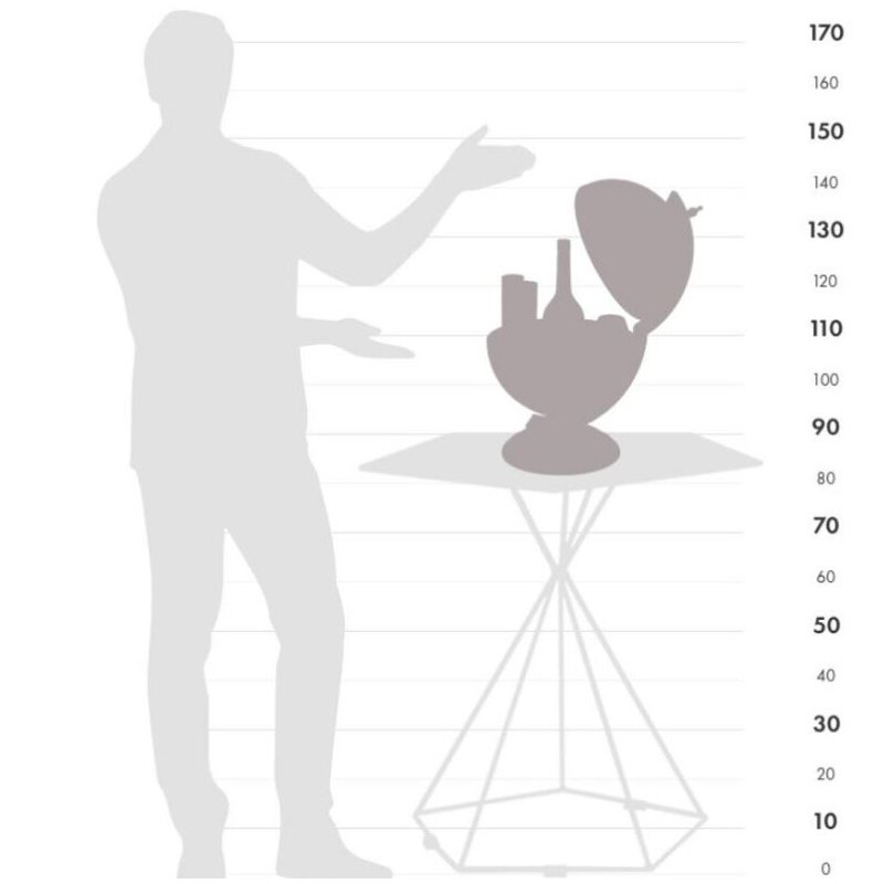 Vintage globus barowy z podstawą z drewna o wyglądzie antycznym i klasyczną mapą w kolorze kości słoniowej. Globus Sfera 33, z pięknymi ilustracjami potworów morskich, syren i postaci mitologicznych, posiada w środku schowek na 1-2 niskie butelki i około 6 szklanek. Globus obraca się wokół swoich południków.