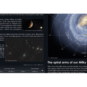 The schematic map in the middle shows exactly where our sun and nearby celestial objects are in the galaxy and provides an overview of the spiral arms. While these rotate in millions of years around the Milky Way Center, the objects go through their own life cycle. This evolution of stars and nebulae and their relationships are explained and illustrated using well-known deep-sky objects.