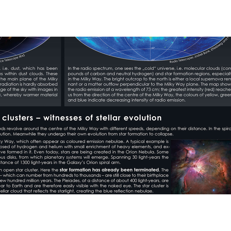 The poster impresses with its large panorama, which shows the visual impression of the Milky Way as a shimmering band in the night sky. On it the most striking constellations, stars and selected celestial objects are marked. On additional individual maps, the image of the galaxy is also displayed in four further wavelength ranges and its physical meaning explained. In addition, texts, photos and graphics deepen the understanding of our cosmic homeland: A journey from our solar system through the Milky Way to the neighboring galaxies gives a clear picture of the distance scales and the structure of the universe.