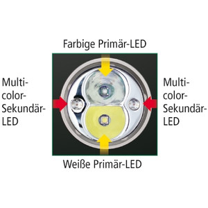 Kolorowa dioda LED jest niebieska. Można ją ustawić w 3 stopniach jasności. Szczególnie nadaje się dla wędkarzy i służb porządkowych, ponieważ niebieskie oświetlenie jest niewidoczne dla ryb i ułatwia wykrywanie płynów.
