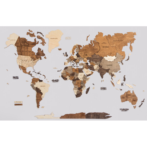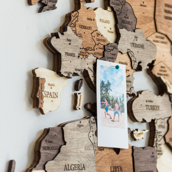 Drewniana mapa nada Twojej ścianie indywidualny charakter. Zaznacz zielonymi pinezkami miejsca, które już odwiedziłeś, a czerwonymi pinezkami swoje kolejne cele. Pinezki są dołączone do zestawu.