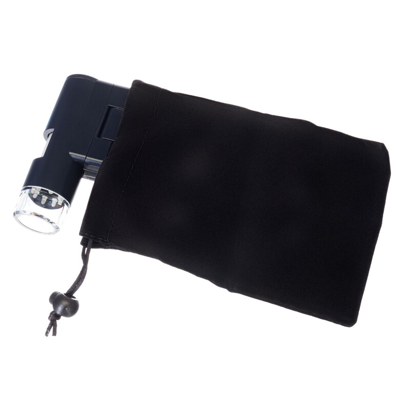 Mikroskop jest pokryty gumą, co zapewnia pewny chwyt. W zestawie znajduje się mały statyw. Nadaje się do długotrwałych obserwacji. Łatwy transport mikroskopu, futerał znajduje się w zestawie.