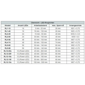 Seria RL4 i RL5 została zaprojektowana przede wszystkim jako oświetlenie padające do mikroskopów. Obszar roboczy oświetlenia pierścieniowego jest tak dobrany, że ogniskowa znajduje się w typowej odległości obiektywu od stolika przedmiotowego standardowych mikroskopów. Obie serie są dostępne z dwoma średnicami wewnętrznymi, dzięki czemu można dobrać odpowiedni model do wszystkich popularnych typów mikroskopów.