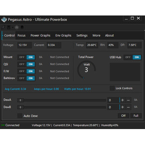Oprogramowanie Stand Alone: oprogramowanie stworzone przez Pegasus Astro umożliwia kontrolę twojego Ultimate Powerbox. Otrzymuj metryki, miej wgląd w dane graficzne, nadaj nazwy poszczególnym portom zasilania, w łatwy i szybki sposób dopasuj każde ustawienie swojego Ultimate Powerboxa.