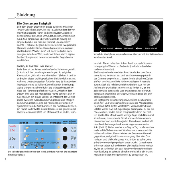 Praktyczny rocznik do torby oferuje miłośnikom przyrody i astronomom co roku krótkie i przejrzyste informacje o wszystkich ważnych wydarzeniach na niebie. Dzięki kalendarzowi z najpiękniejszymi wydarzeniami i comiesięcznym informacjom o ruchu Słońca, Księżyca i planet miłośnicy gwiazd nie przegapią żadnego niebiańskiego spektaklu. Liczne wskazówki dotyczące obserwacji i instrukcje dotyczące znajdowania konstelacji uzupełniają ten odporny na warunki atmosferyczne rocznik.