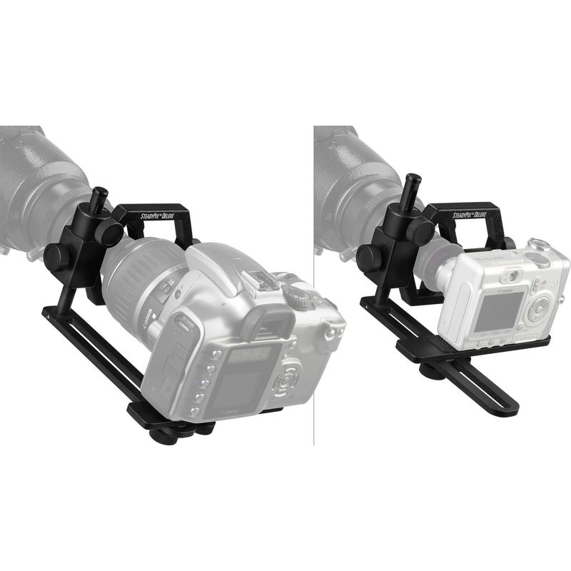 This nifty device holds virtually any digital or film camera up to the eyepiece of any telescope to capture images of the Moon, planets, bright deep-sky objects, or terrestrial subjects. An improvement over existing designs, SteadyPix locks the camera lens in position at just the right distance and orientation relative to the eyepiece to achieve precise focus and centering of the image for afocal photography. SteadyPix attaches directly to any standard 1.25" telescope eyepiece with one of two felt-lined eyepiece clamps provided (for standard or large-size 1.25" eyepieces). The camera threads on to a 1/4"-20 pedestal via the threaded hole in the camera body. Eyepieces with long eye relief are recommended to minimize vignetting of images. Our Epic or Lanthanum series (standard, not Superwides) eyepieces are ideal. Fits 1.25" eyepieces only.