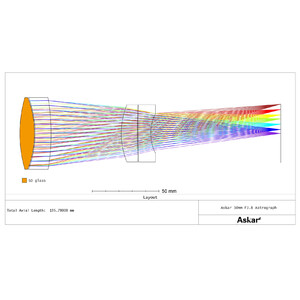 Askar 50P to 4-elementowy apochromat według Petzvala. W obiektywie zastosowano szkło SD zapewniające dobrą korekcję aberracji chromatycznej. Apo jest skorygowany dla aparatów fotograficznych do pełnego formatu.