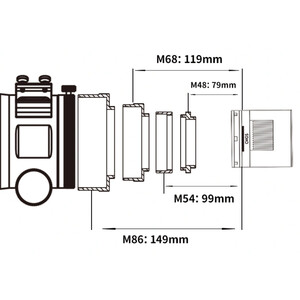 Konstrukcja samowyrównująca. Nie potrzebują Państwo dodatkowego spłaszczacza (flattener). Nie ma również konieczności przestrzegania określonej ogniskowej tylnej. Mogą Państwo po prostu podłączyć dowolne akcesoria, o ile mieszczą się one w ogniskowej. Do obserwacji wizualnych dostępna jest ogniskowa 120 mm dla zwierciadła kątowego lub innych akcesoriów.