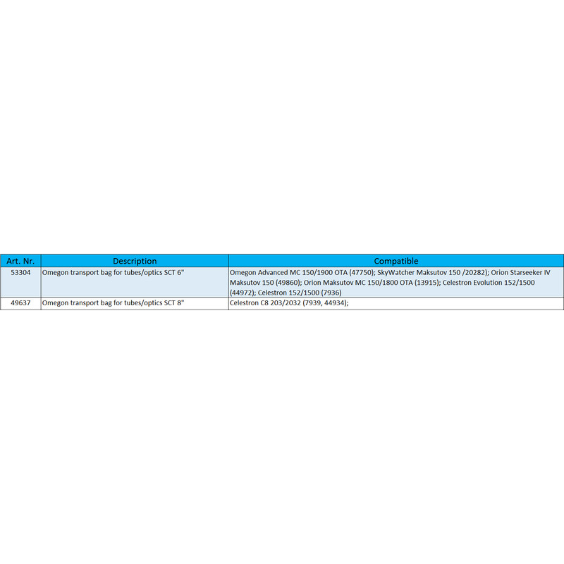 Ta torba świetnie nadaje się do wszystkich tub optycznych 8 cali o konstrukcji Schmidta-Cassegraina lub Maksutowa. Dzięki średnicy 320 mm i długości 620 mm mieszczą się w niej takie tuby optyczne, jak: