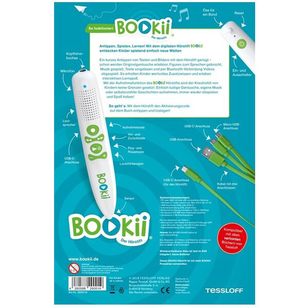 Dzięki pióru dźwiękowemu BOOKii dzieci odkrywają książki w zabawny sposób. Poprzez krótkie dotknięcie tekstów i obrazów kompatybilnych z BOOKii za pomocą pióra audio, doświadczają oryginalnych dźwięków, sprawiają, że postacie mówią, słuchają muzyki, czytają im teksty i mogą oglądać filmy przez połączenie Bluetooth. Zdobywają cenną dodatkową wiedzę i zaskakujący wgląd w różne światy tematyczne. Dobra rozrywka jest gwarantowana - a nauka odbywa się przy okazji.