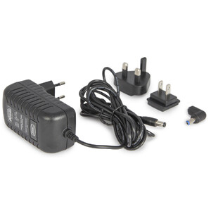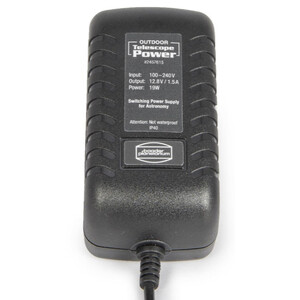 Nowy zasilacz Outdoor-Telescope-Power zmienia wszystkie powszechnie stosowane na świecie zakresy napięcia AC od 90 do 260 V w napięcie DC 12,8 V/1,5A i nawet przy ekstremalnie niskich temperaturach napięcie to nie spada tak bardzo, aby elektroniczne elementy albo silniki spowodowały awarię montażu teleskopu. Dzięki ciągłej mocy 1,5A/19W, nawet przy pełnym obciążeniu istnieją wystarczające rezerwy mocy, także przy zamontowaniu cięższych instrumentów na montażu albo dużych zmianach obciążenia. Dodatkowo, do zwiększonego napięcia podstawowego, zakres temperatur od -25° do +40° jest optymalnie dopasowany do pracy na zewnątrz. Dzięki przedłużonemu do 2,5m kablowi zasilającemu, między zasilaczem a wtyczką kątową nie ma niebezpieczeństwa potknięcia i można go spokojnie umieścić na podłodze. Wtyczka kątowa chroni elektronikę teleskopu przed uszkodzeniem gniazdka wtykowego, a zasilacz przed przerwaniem kabla lub podobnymi uszkodzeniami. Przy przypadkowym nadepnięciu na kabel, boczne naprężenia nie powodują wyrwania gniazdka z teleskopu, a rozłączenie następuje w linii prostej bezpośrednio w punkcie łączenia wtyczki kątowej.