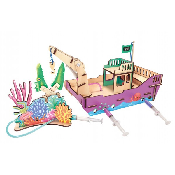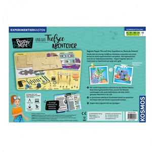 Inhalt: 36-seitige Anleitung mit illustrierter Geschichte, Holzstecksystem zum Aufbau des Forschungsschiffs und der Tiefsee-Welt, Schläuche und Pumpen für Hydraulik-Experimente, Schnüre, Gummis, Binderschrauben, Stäbe, Motor, Propeller, Batteriefach und Kabel, weiteres Experimentiermaterial wie Messbecher, Farbpulver, Rührspatel, Stanzbogen, Pepper Mint-Spielfigur, zusätzlich wird benötigt: 2 x 1,5-Volt-Batterie Typ LR6 (AA, Mignon).